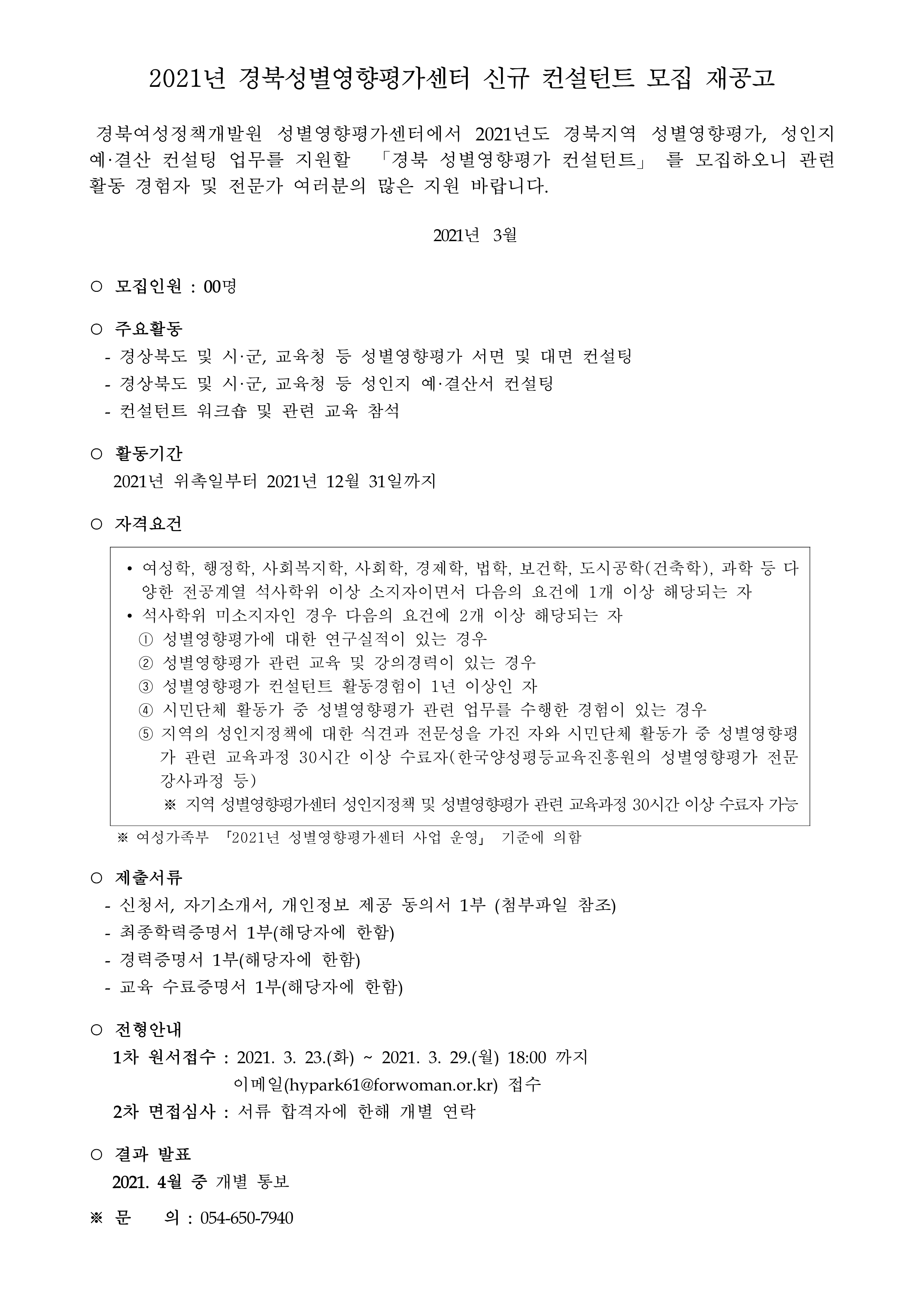 | 2021년 경북성별영향평가센터 신규 컨설턴트 모집 | |||||