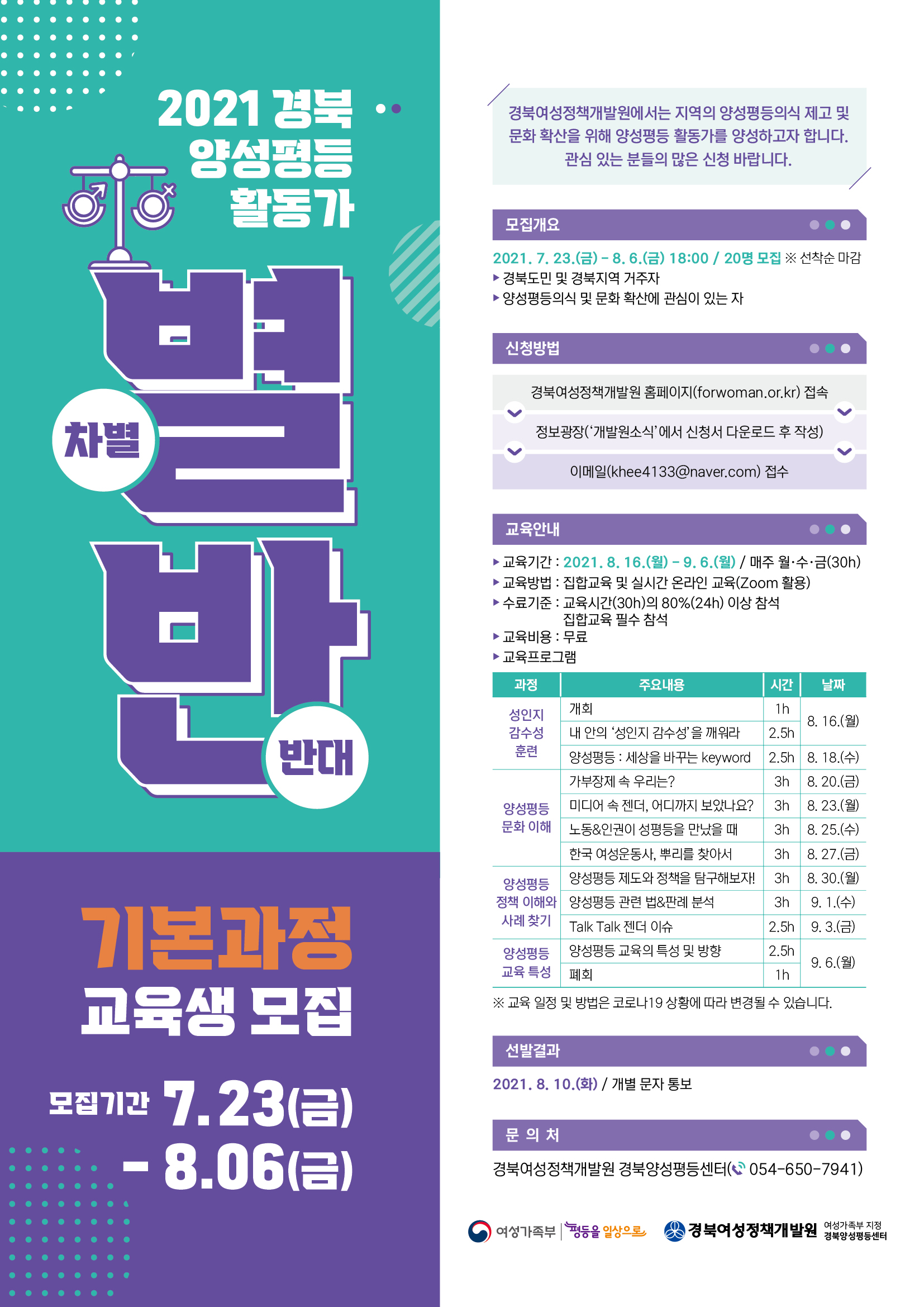 2021년 양성평등 활동가 ‘별반(차별반대)’ 양성과정(기본과정) 교육생 모집합니다.