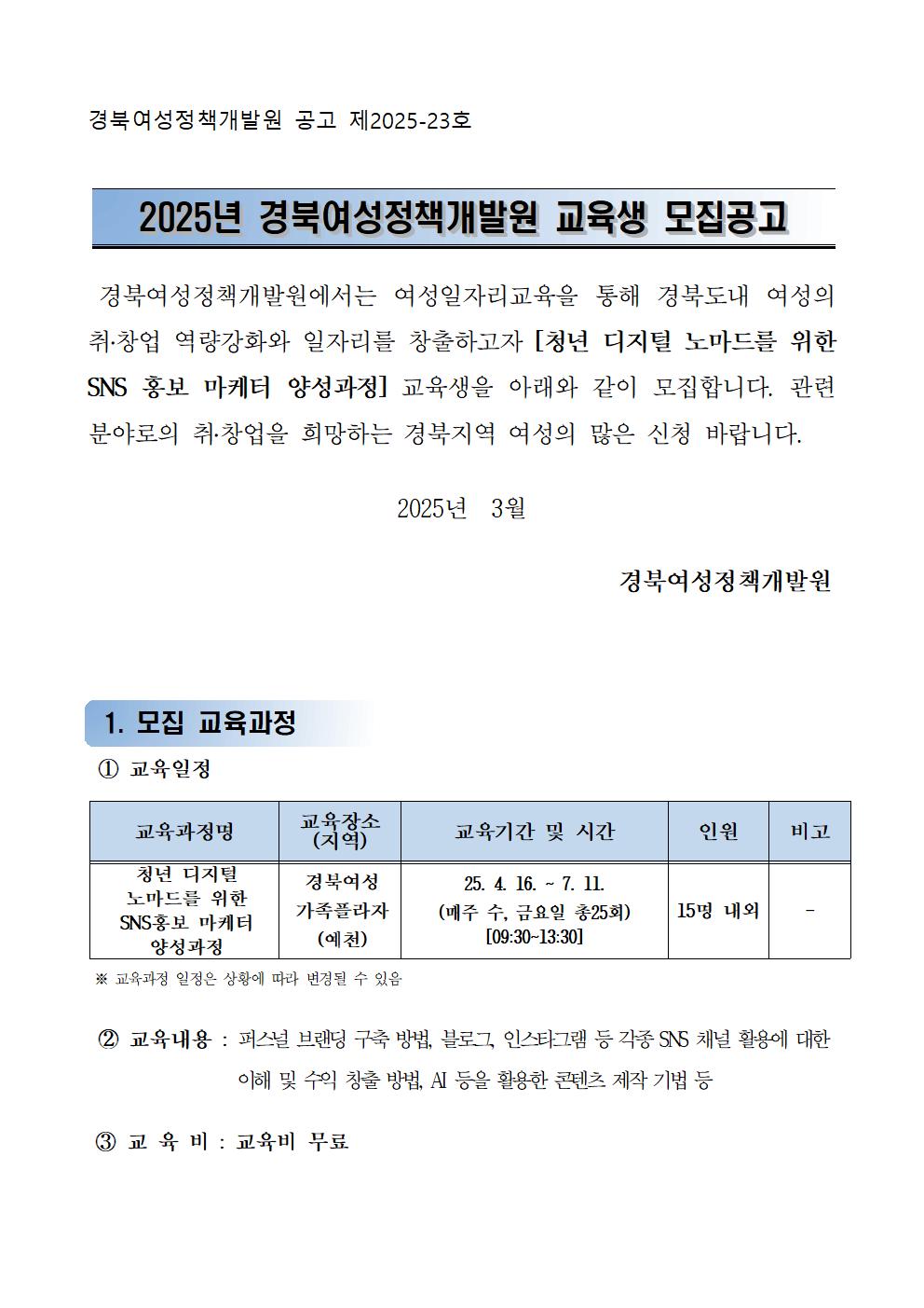 | [제2025-23호] SNS 홍보 마케터 양성과정 교육생 모집! | |||||