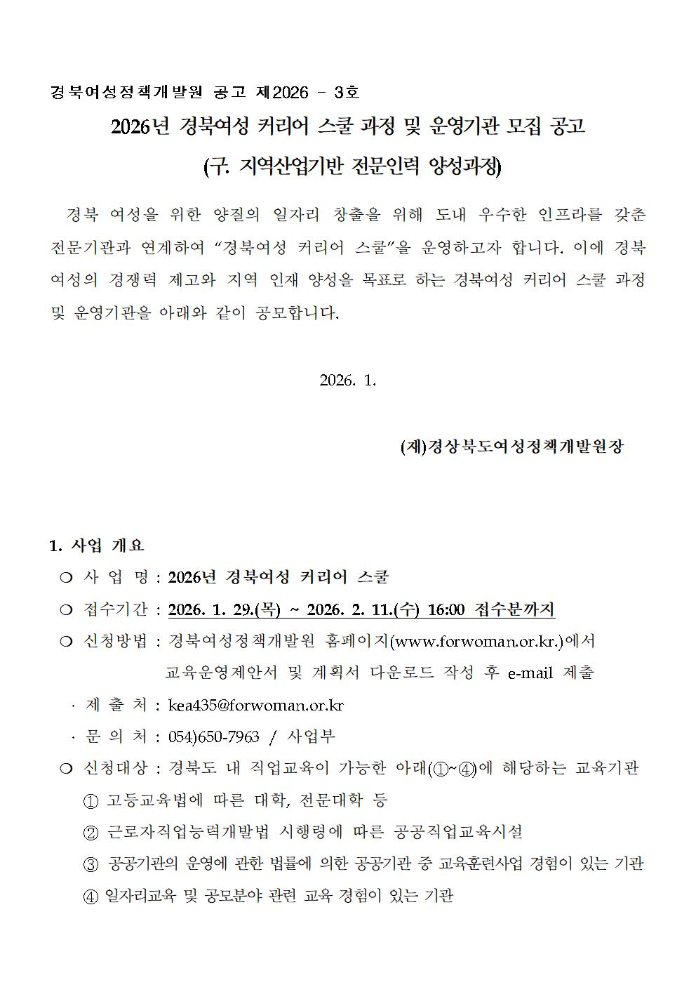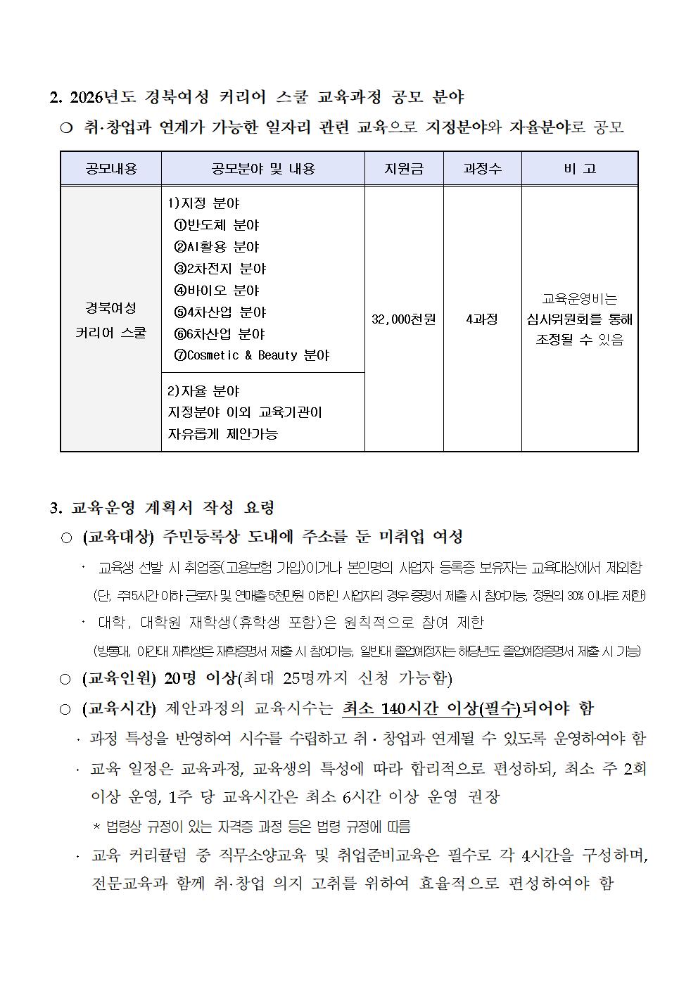 | 정정[제2026-3호] 2026년 경북여성 커리어 스쿨 과정 및 운영기관 모집 공고(구.지역산업기반 전문인력 양성과정) | |||||