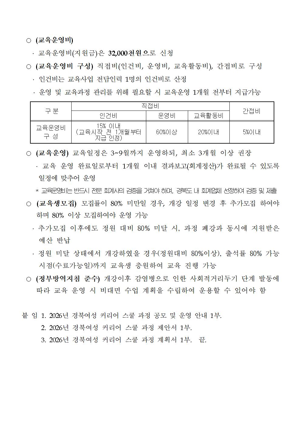 * 정정사항 * '붙임 1 공모 게시문', '붙임 2 공모 및 운영 안내' 파일의 (교육운영) 부분 수정 *정정 내용* ○ (교육운영) 교육일정은 3~9월까지 운영하되, 최소 3개월 이상 권장 · 교육 운영 완료일로부터 1개월 이내 결과보고(회계정산)가 완료될 수 있도록 일정에 맞추어 운영
